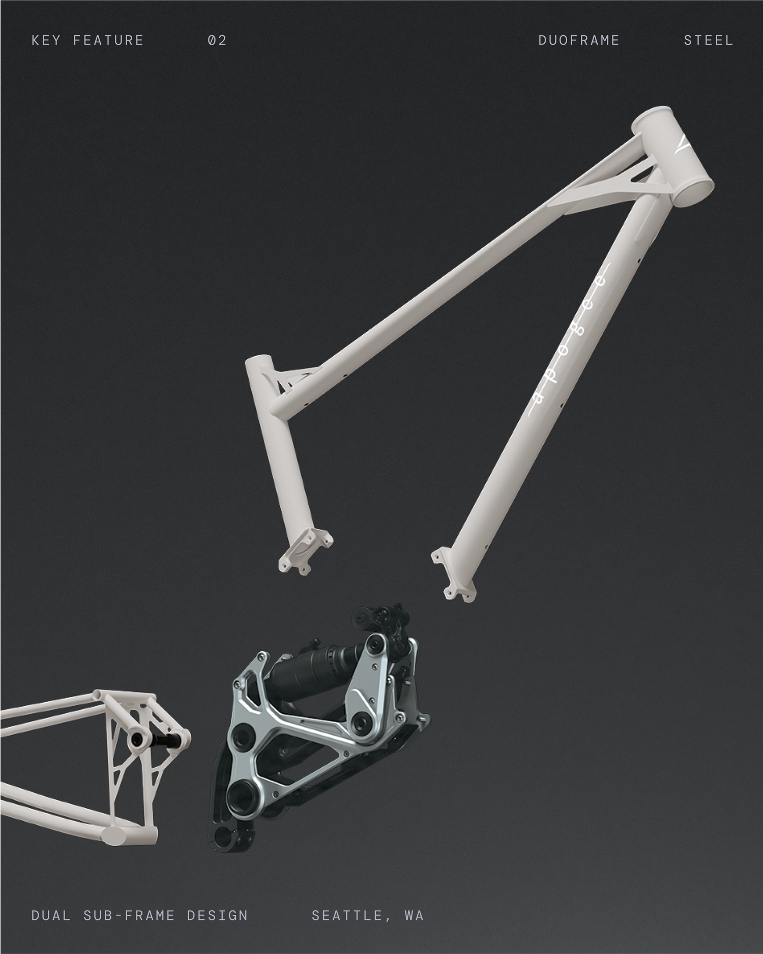 Decoupling the frame and suspension means we can tune the size and response of the front and rear triangles without affecting the suspension giving the Apogee One an unparalleled fit and a ride like no other steel mountain bike out there.